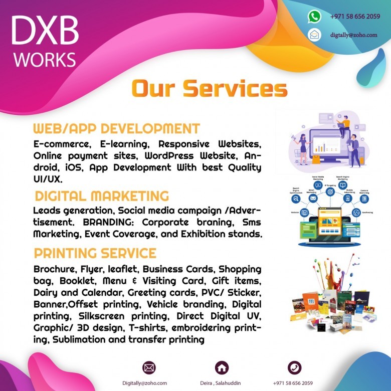 GENERAL PRINTING. All types of Indoor/Outdoor, Press, Sublimation, Design/PrintCatalogs, Visiting Card, Brochure, Bill Board, Roll-Ups, Exhibition Stands, and-Shirts gift items, 2D/3D Analogue/Digital Signage’s, Vehicle Graphics, etc.